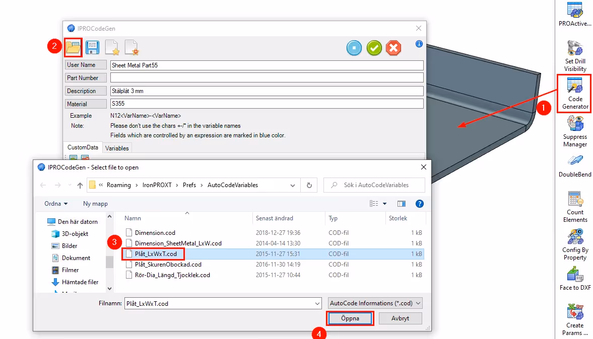 3) Select the file Sheet_LxWxT.cod