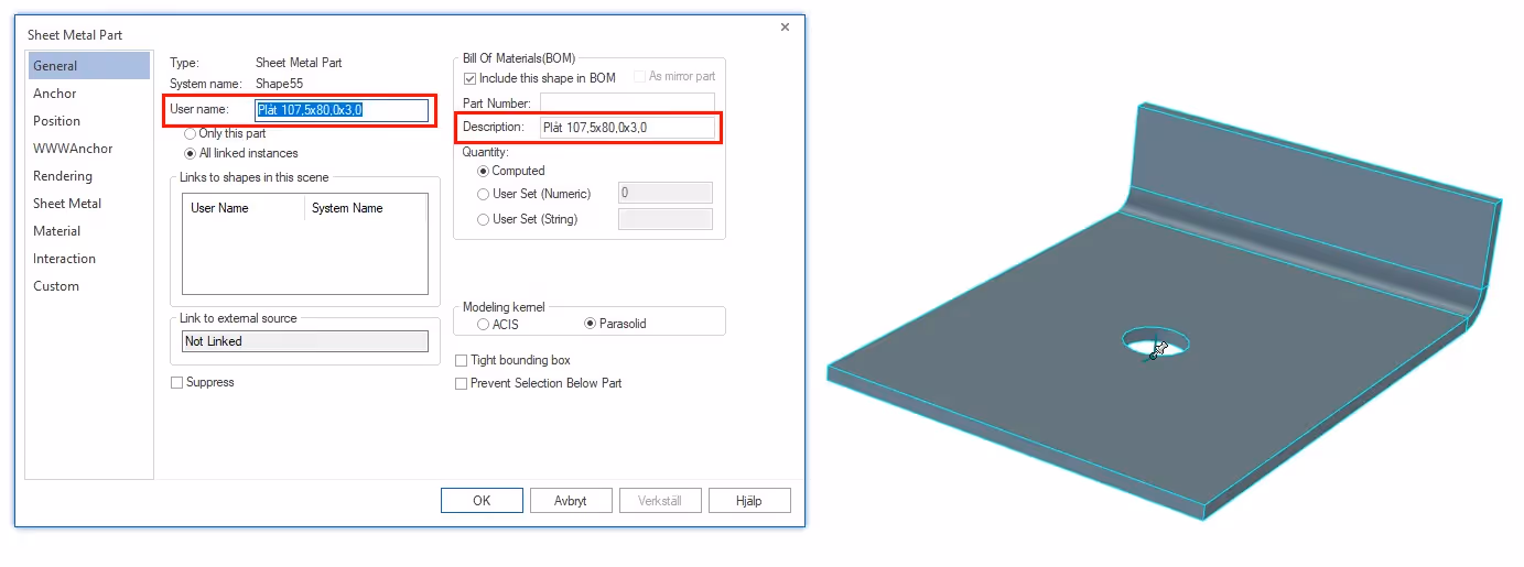 Below is an example of how we can display sheet metal dimensions in the history tree and under the sheet metal part properties, which allows us to make it appear in the BOM. If the size of the plate is changed, the corresponding values in the properties are updated directly.