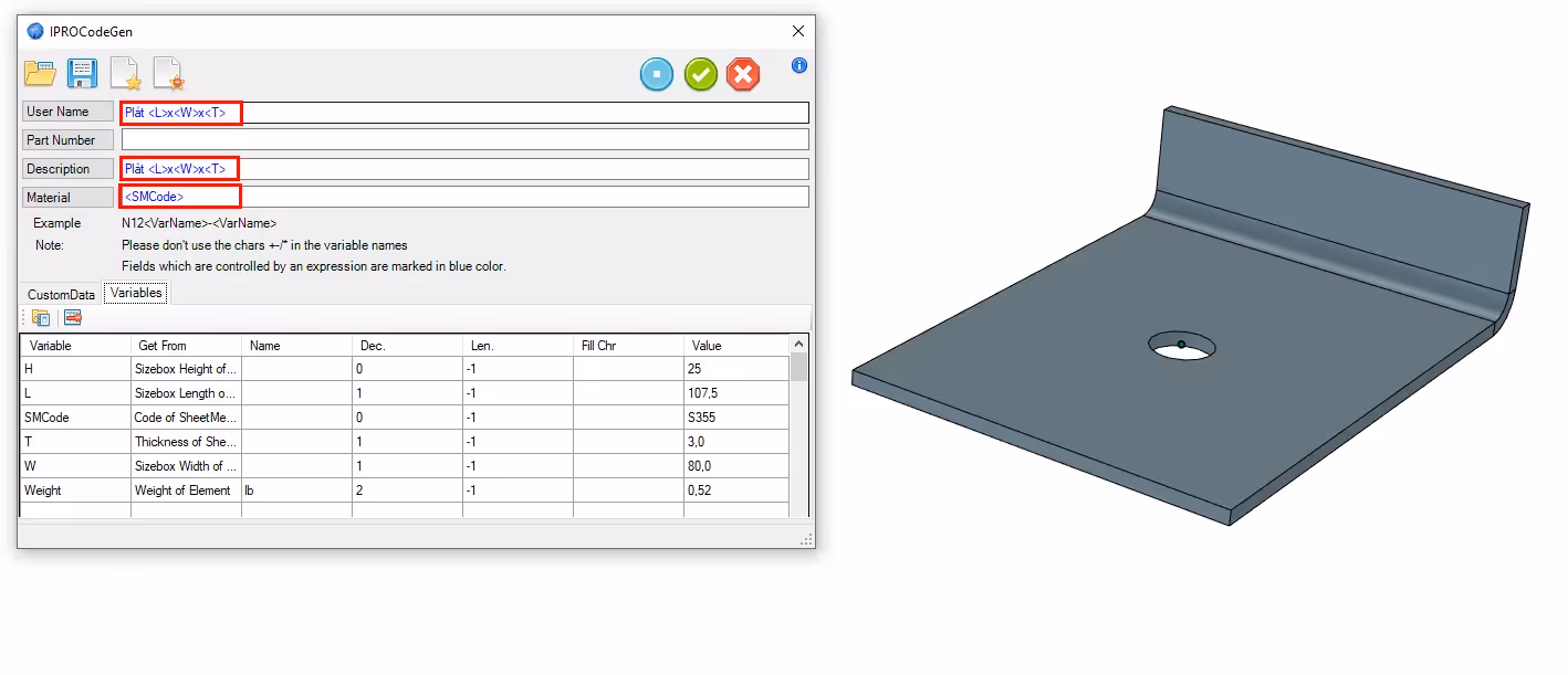 Variables defines the variables to be used for a CustomData, User Name, Part Number, Description or Material.