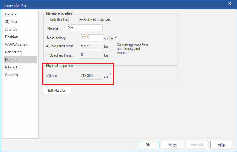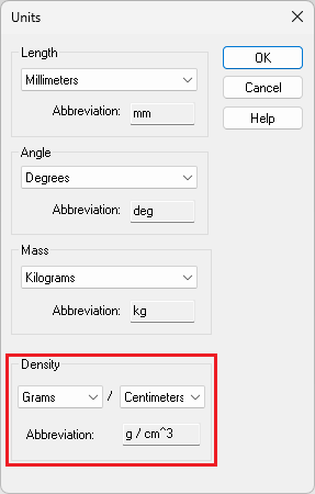 The selected "unit of length" for volume is also applied as the unit for a parts volume parts . If you select kg/m³, the volume is also displayed in m³. If you select g/cm³, the volume is also displayed in cm³.
