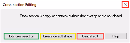 First ofall - it is not possible to finish a sketch building a Shape -feature if any of these three "problems" have occurred in the sketch. If this happens and you see this message, choose either Edit Cross-Section (green highlight) or Create Default Shape (yellow highlight).