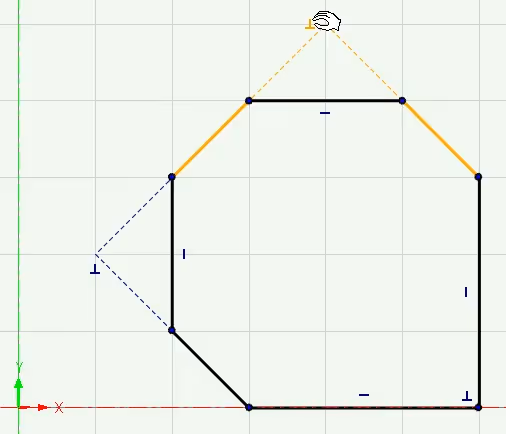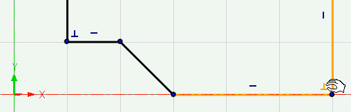 They also appear between lines, circles or arcs that have "smooth" tangent relation. When locked as a constraint, they are shown in red, which we'll look at later. By placing the mouse cursor on an indicator, an orange color shows which lines are indicated to have a temporary (blue indicator) or permanent (red indicator) relationship with each other.