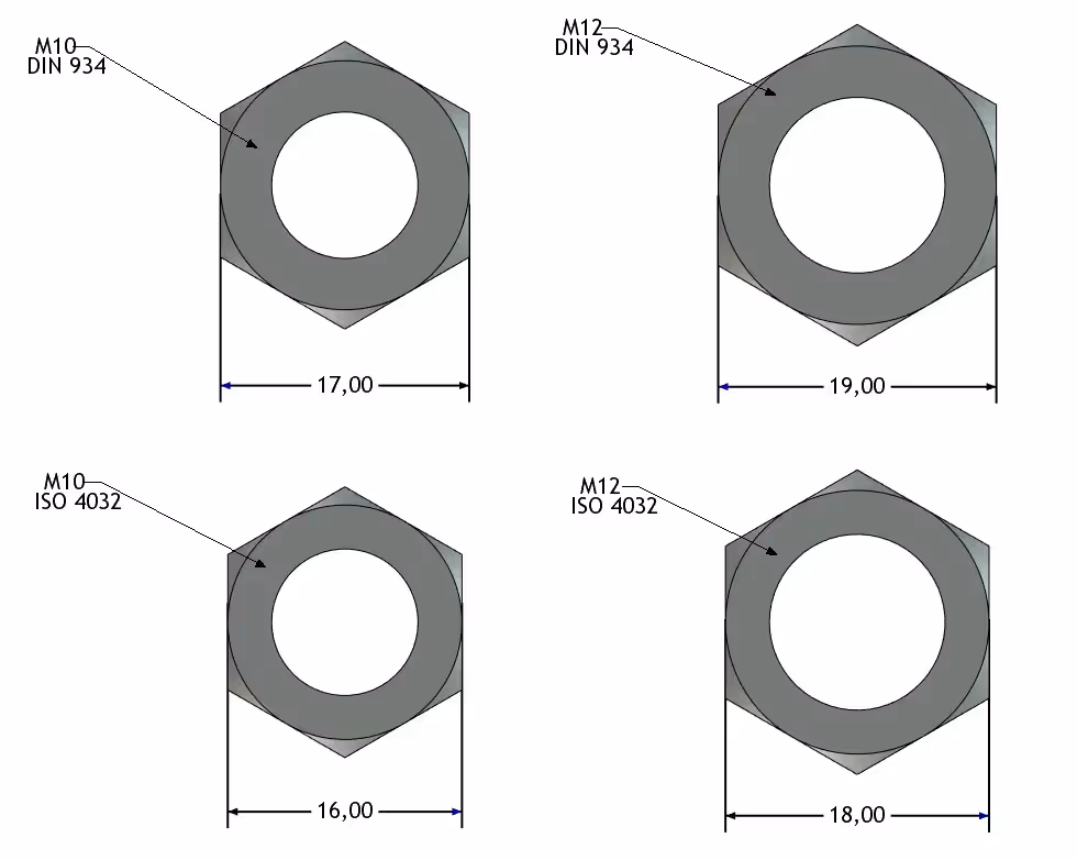 Not everyone may be aware that the key widths of M10 and M12 nuts are different, depending on whether they follow the DIN 934 or ISO 4032 standard. In the picture below, you can see that an M10 nut can be either 16 or 17 mm wide, while an M12 nut can be either 18 or 19 mm wide. This is also the case for the less common M14 nuts which can be either 21 or 22 mm wide.