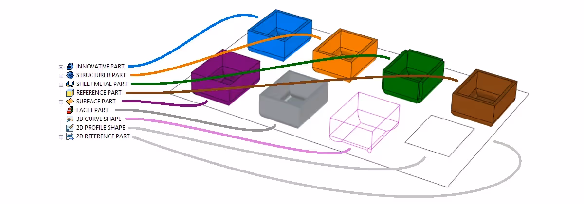 IRONCAD is in many ways an incredibly versatile 3D CAD system. There are several "parallel" types of 3D objects to use, more than in most other 3D CAD systems. These are also called 3D elements in IRONCAD , where each type of 3D element has its own properties and functions that are optimized to produce different types of models.