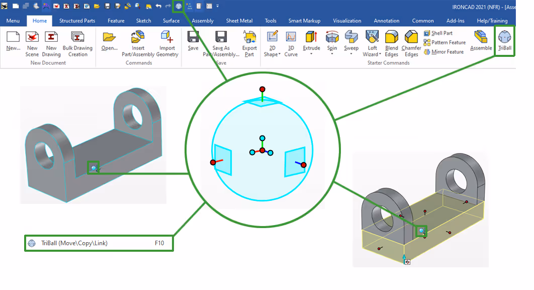 It is quick and easy to add parametric controls to the Sizebox handles that control the size of a feature, part or assembly. By default, the Sizebox handles are primarily displayed on Shape features such as a Block, but it is also possible to add the corresponding Sizebox handles at the part or assembly level.