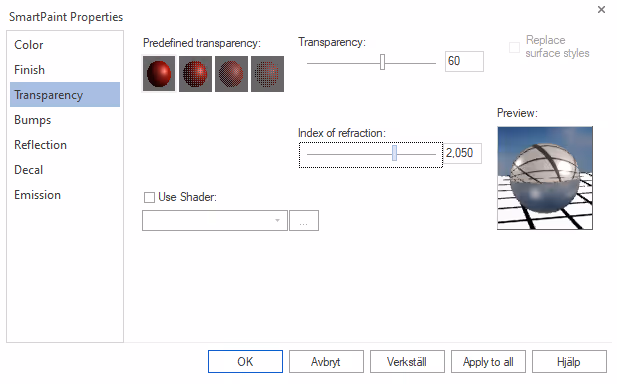 When rendering something transparent, you should look at Transparency-tab under Smart Paint. Here we have preset parameters and also a simple slider, the more to the right the more transparency.