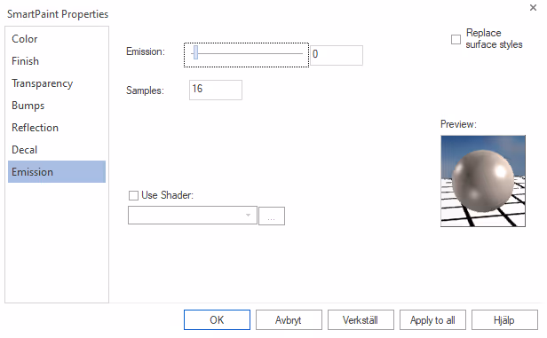 Emission i Smart Paint is a method to create materials that glow and emit a light. Change the bar Emission bar to make the material glow with the desired intensity and change Sampels for how many times this will be calculated by the computer, the higher Samples the more accurate the calculation of the light emitted.