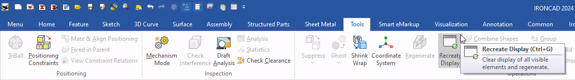 For some (to us) unknown reason, it sometimes happens that green lines "stick" to the screen in the 3D scene. In the context of some commands and tools where edges are selected, the graphics card cache memory is not reset properly. To restore the graphics, click on the button Recreate Display button under the Tools tab.