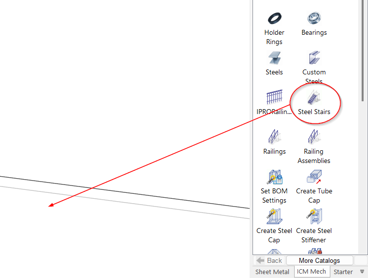 You can find the Steel Stairs command in the ICM Mech catalog. It is used to place steel stair structures consisting of steps, stringers, and a landing in your 3D scene.