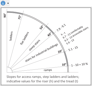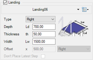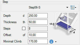 In the third section, you can select the type of steps, their size, the offset in relation to the side parts, and the minimum rise between steps (or, slightly above, specify the number of steps). The info icon allows you to display a diagram for the correct dimensioning of the staircase.