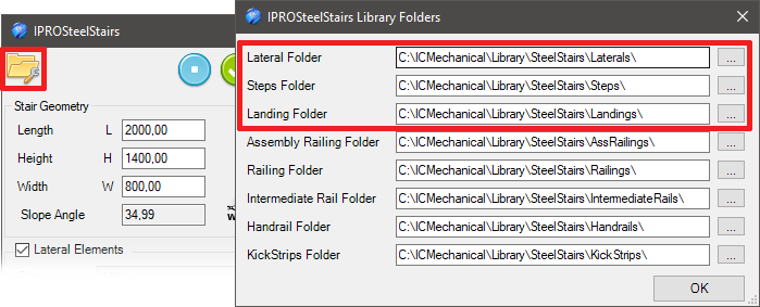 The first icon at the top left of the dialog box opens the settings for the folders in the Steel Stair Library, where you can save custom components such as side parts, steps, landings, and railings.