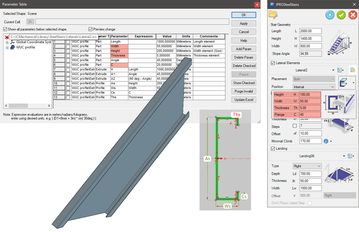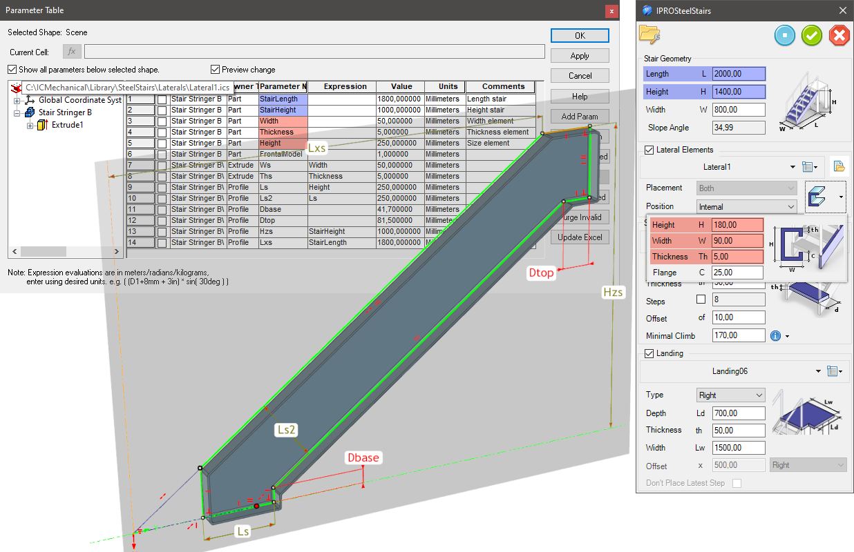 In order to adapt the steps to the size of the staircase, the steps must contain the following parameters (at the part or assembly level):