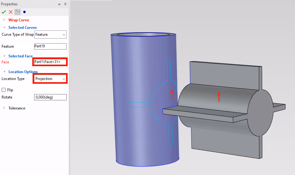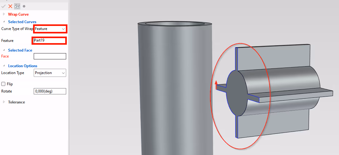 (1) Make sure the Curve Type of Wrap is on Feature. ( 2) Now click on the 2D profile. (3) Then click on the wrap surface. (4) Make sure that Location Type is set to Projection. (5) Then click on Apply: