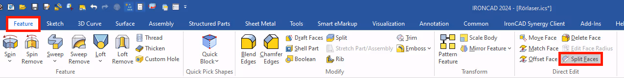 The 2D profile has now been projected onto the surface of the jacket. Now go to the Feature tab followed by Split Faces: